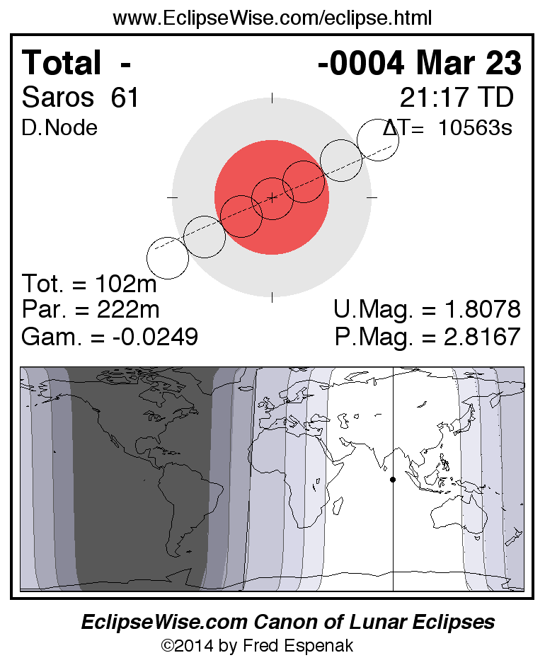 Total Lunar Eclipse of -0004 Mar 23 (0005 Mar 23 BCE)