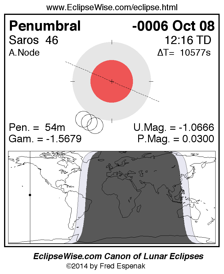 The penumbral lunar eclipse of -0006 Oct 08 is followed two weeks later by a total solar eclipse on -0006 Oct 23.