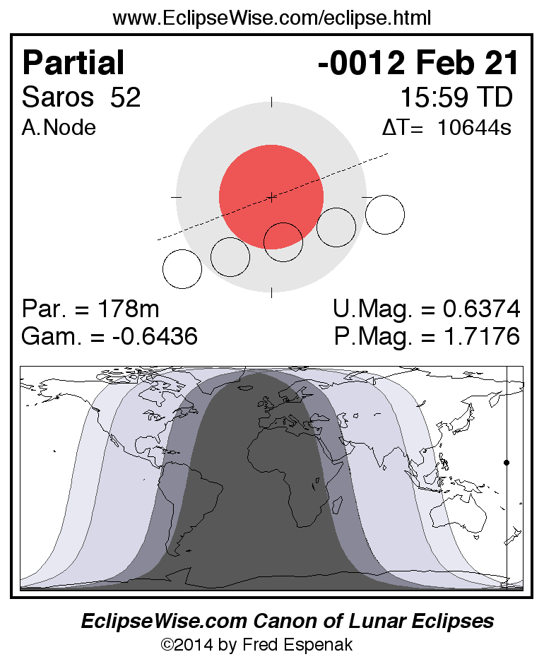 The partial lunar eclipse of -0012 Feb 21 is followed two weeks later by a total solar eclipse on -0012 Mar 06.