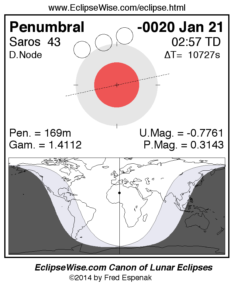The instant of greatest eclipse takes place on -0020 Jan 21 at 02:56:31 TD (23:57:45 UT1).