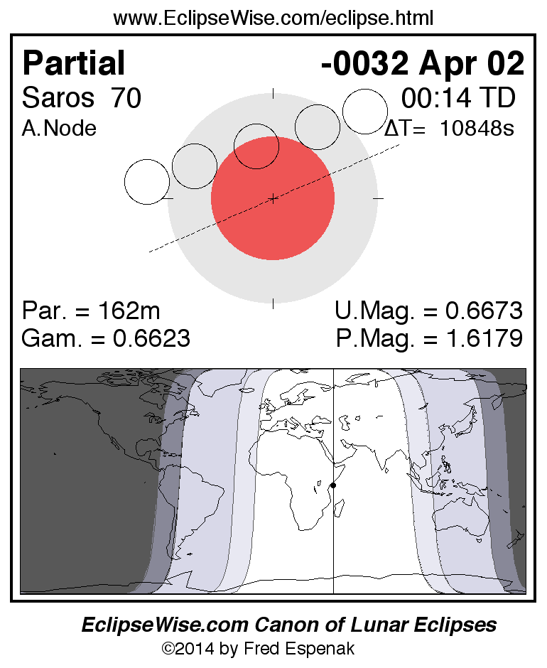 The instant of greatest eclipse takes place on -0032 Apr 02 at 00:14:27 TD (21:13:40 UT1).