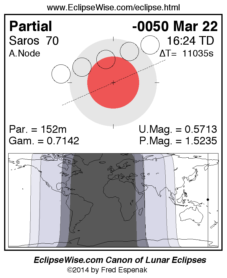 The instant of greatest eclipse takes place on -0050 Mar 22 at 16:24:25 TD (13:20:31 UT1).
