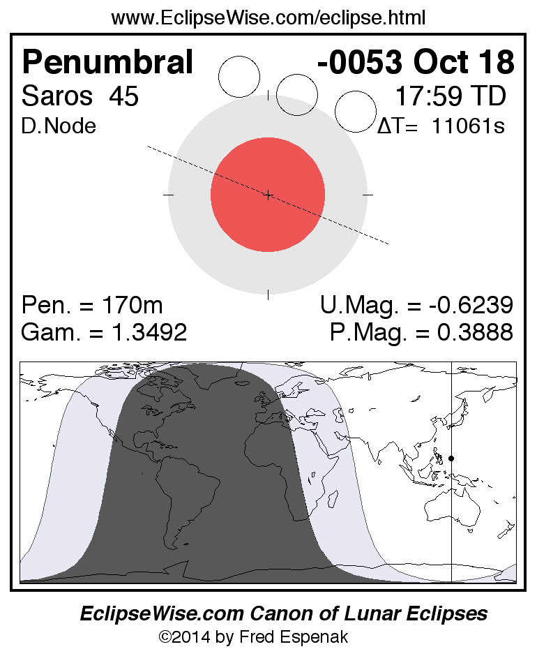 The instant of greatest eclipse takes place on -0053 Oct 18 at 17:58:35 TD (14:54:16 UT1).