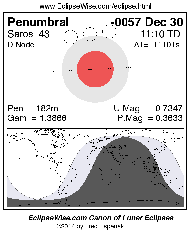 Penumbral Lunar Eclipse of -0057 Dec 30 (0058 Dec 30 BCE)
