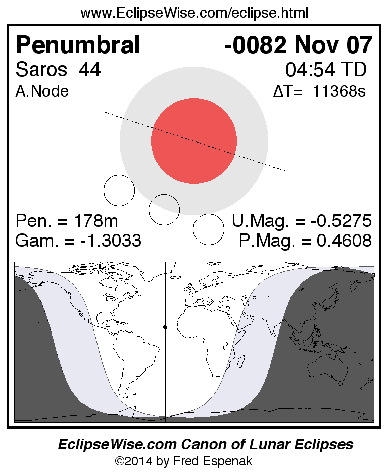The instant of greatest eclipse takes place on -0082 Nov 07 at 04:54:28 TD (01:45:02 UT1).