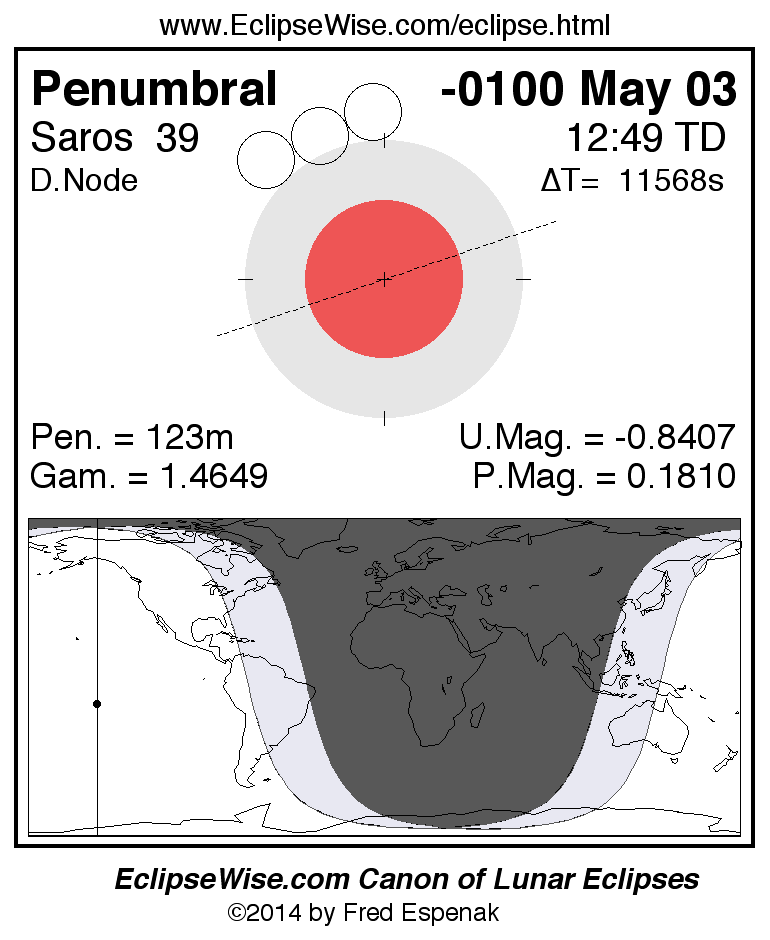 The penumbral lunar eclipse of -0100 May 03 is followed two weeks later by a hybrid solar eclipse on -0100 May 17.