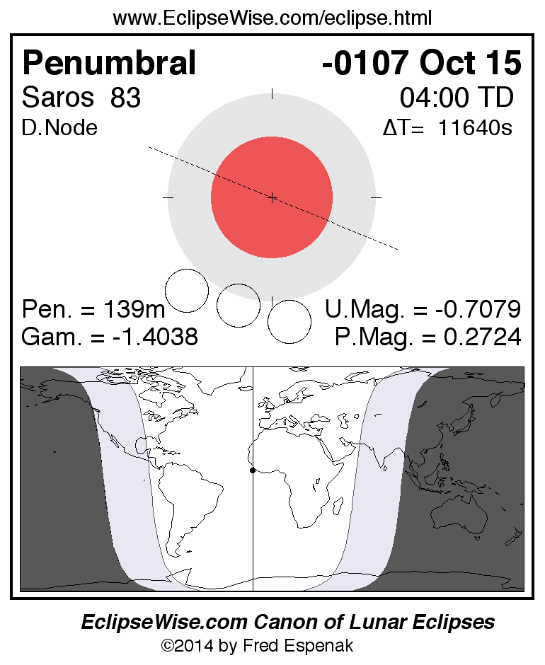 The instant of greatest eclipse takes place on -0107 Oct 15 at 03:59:32 TD (00:45:33 UT1).