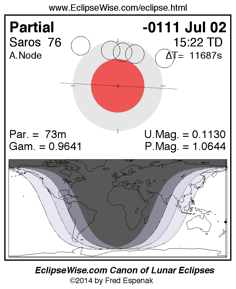 The instant of greatest eclipse takes place on -0111 Jul 02 at 15:21:54 TD (12:07:08 UT1).