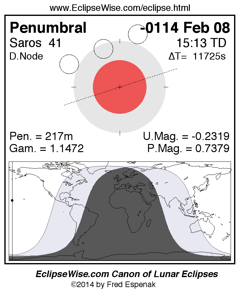 The instant of greatest eclipse takes place on -0114 Feb 08 at 15:13:00 TD (11:57:37 UT1).