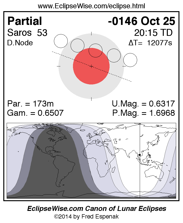 The instant of greatest eclipse takes place on -0146 Oct 25 at 20:14:55 TD (16:53:40 UT1).
