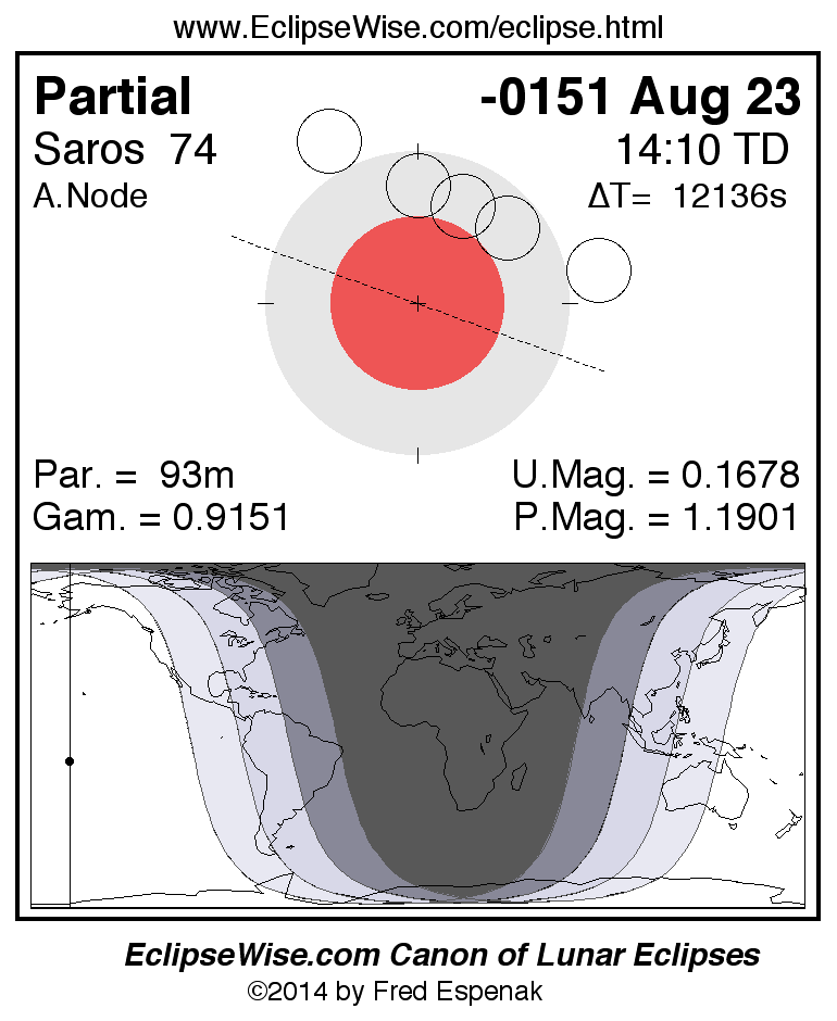 The instant of greatest eclipse takes place on -0151 Aug 23 at 14:09:60 TD (10:47:46 UT1).