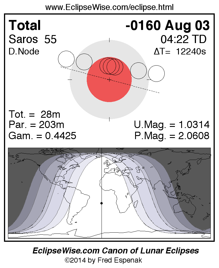 The instant of greatest eclipse takes place on -0160 Aug 03 at 04:21:35 TD (00:57:36 UT1).