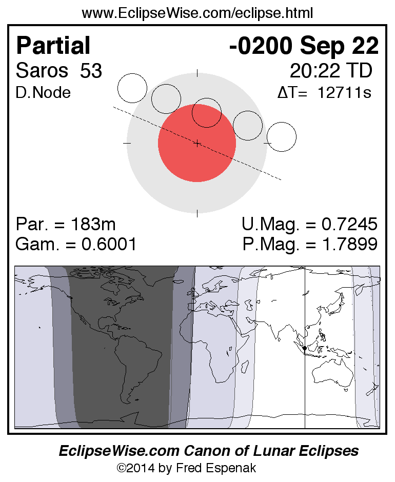 The partial lunar eclipse of -0200 Sep 22 is followed two weeks later by a total solar eclipse on -0200 Oct 08.