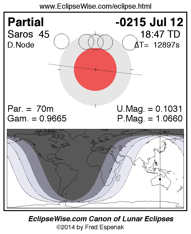 The instant of greatest eclipse takes place on -0215 Jul 12 at 18:46:47 TD (15:11:52 UT1).