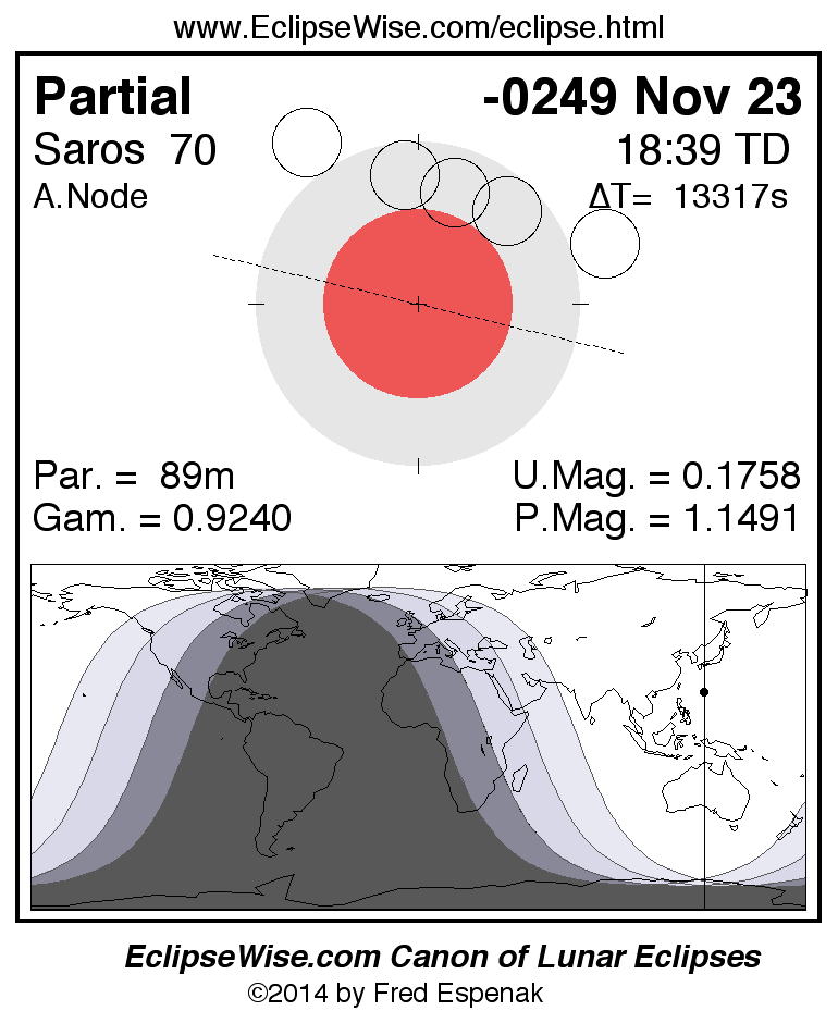 The instant of greatest eclipse takes place on -0249 Nov 23 at 18:38:45 TD (14:56:49 UT1).