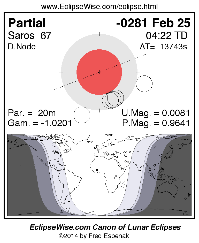 The instant of greatest eclipse takes place on -0281 Feb 25 at 04:22:09 TD (00:33:08 UT1).