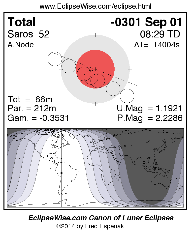 The instant of greatest eclipse takes place on -0301 Sep 01 at 08:29:28 TD (04:36:06 UT1).