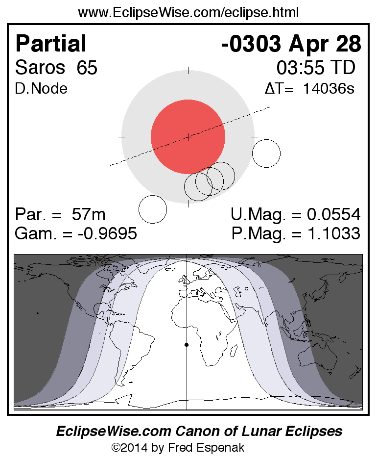 The instant of greatest eclipse takes place on -0303 Apr 28 at 03:54:57 TD (00:01:03 UT1).