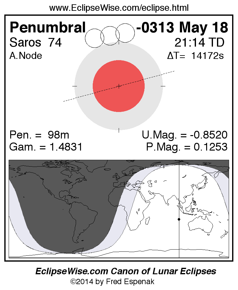 Another lunar eclipse occurs one synodic month before the -0313 May 18 eclipse. It is the penumbral lunar eclipse of -0313 Apr 19.