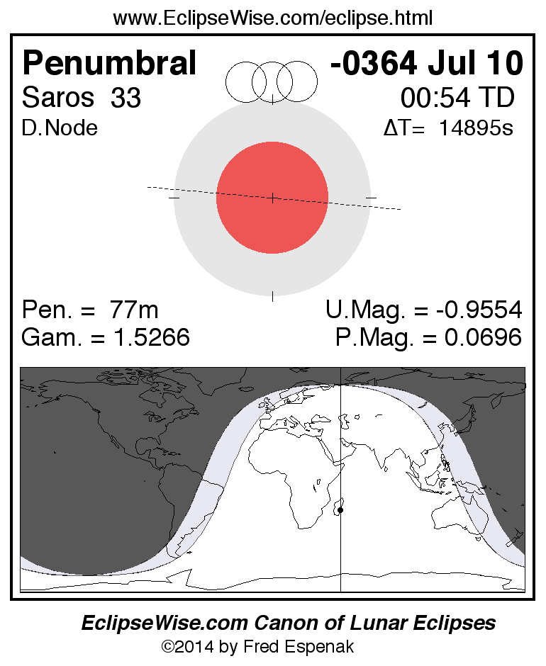 The instant of greatest eclipse takes place on -0364 Jul 10 at 00:54:14 TD (20:46:01 UT1).