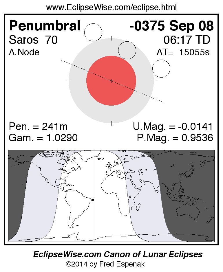 Another lunar eclipse occurs one synodic month before the -0375 Sep 08 eclipse. It is the penumbral lunar eclipse of -0375 Aug 09.