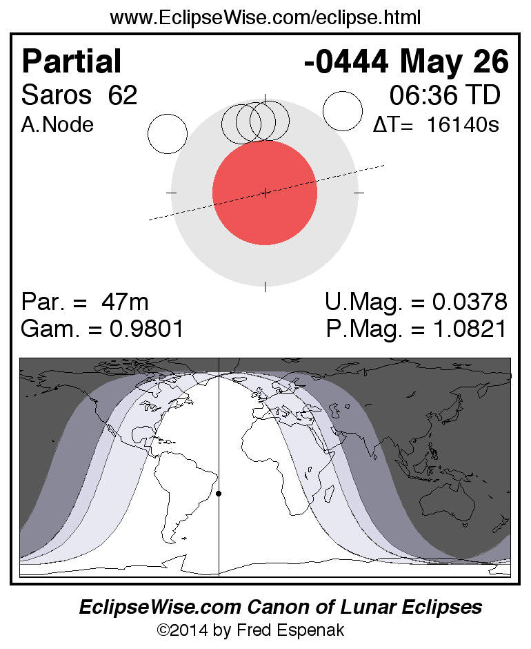 The instant of greatest eclipse takes place on -0444 May 26 at 06:36:01 TD (02:07:04 UT1).