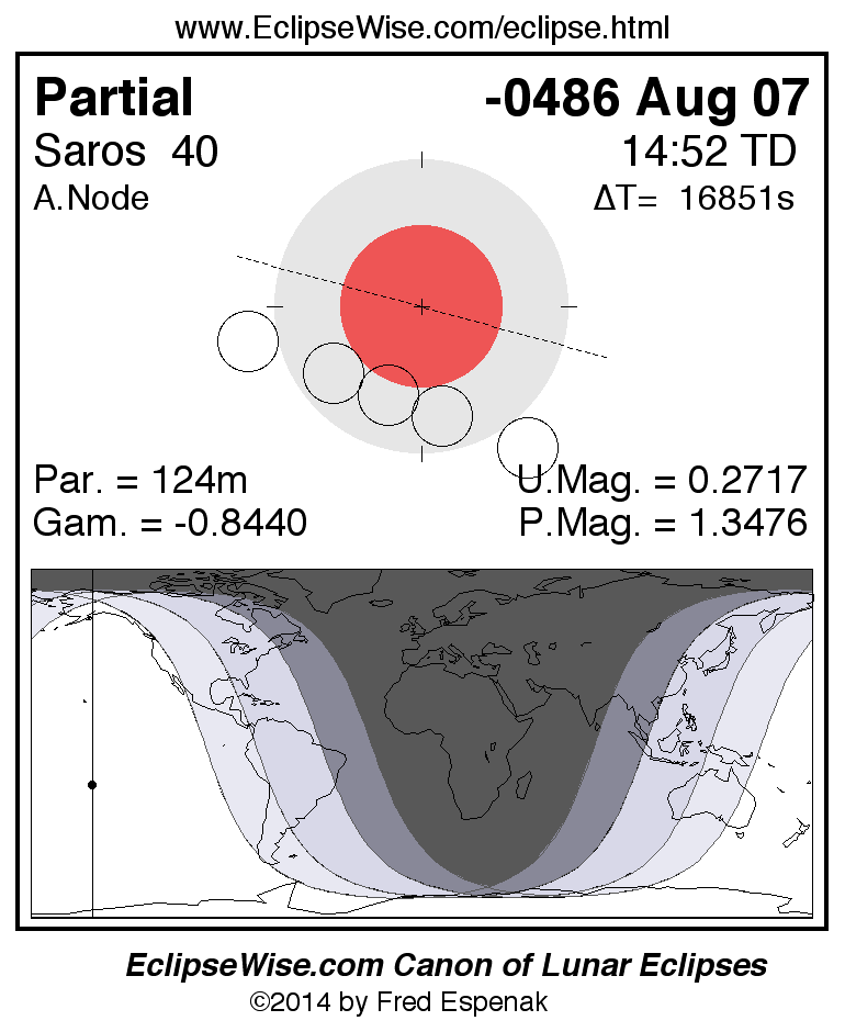 The instant of greatest eclipse takes place on -0486 Aug 07 at 14:52:13 TD (10:11:25 UT1).