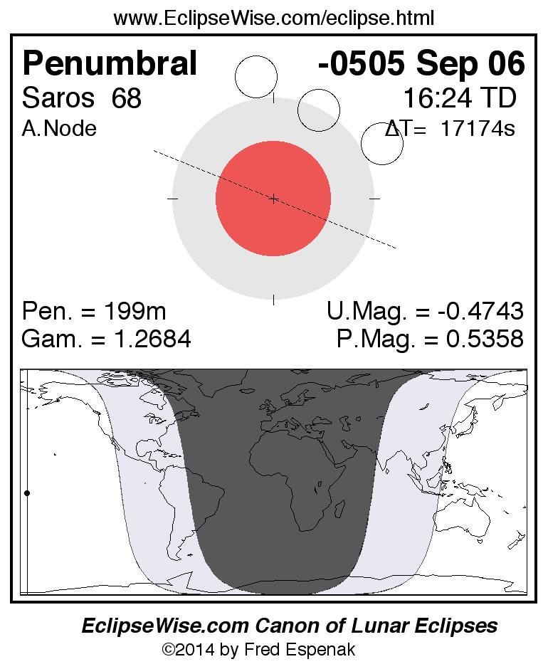 Another lunar eclipse occurs one synodic month before the -0505 Sep 06 eclipse. It is the penumbral lunar eclipse of -0505 Aug 08.