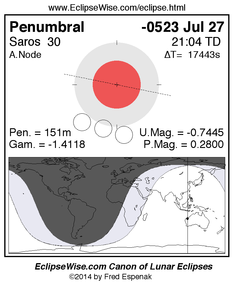 Another lunar eclipse occurs one synodic month after the -0523 Jul 27 eclipse. It is the penumbral lunar eclipse of -0523 Aug 26.