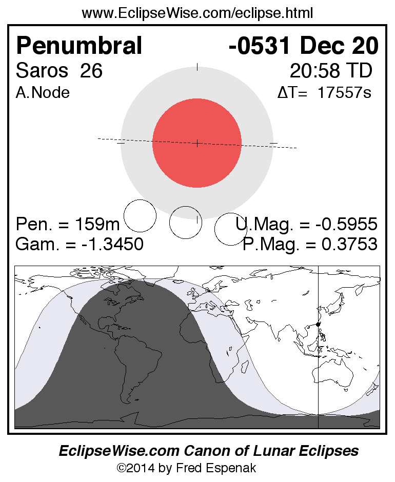 The instant of greatest eclipse takes place on -0531 Dec 20 at 20:58:19 TD (16:05:44 UT1).