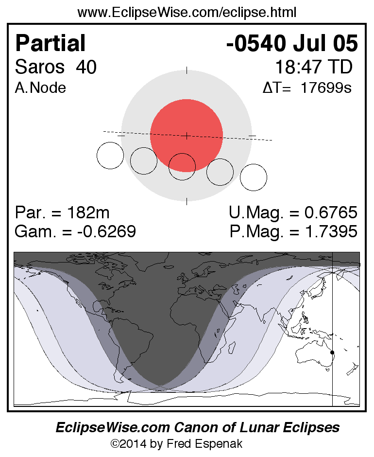 The instant of greatest eclipse takes place on -0540 Jul 05 at 18:47:00 TD (13:52:04 UT1).