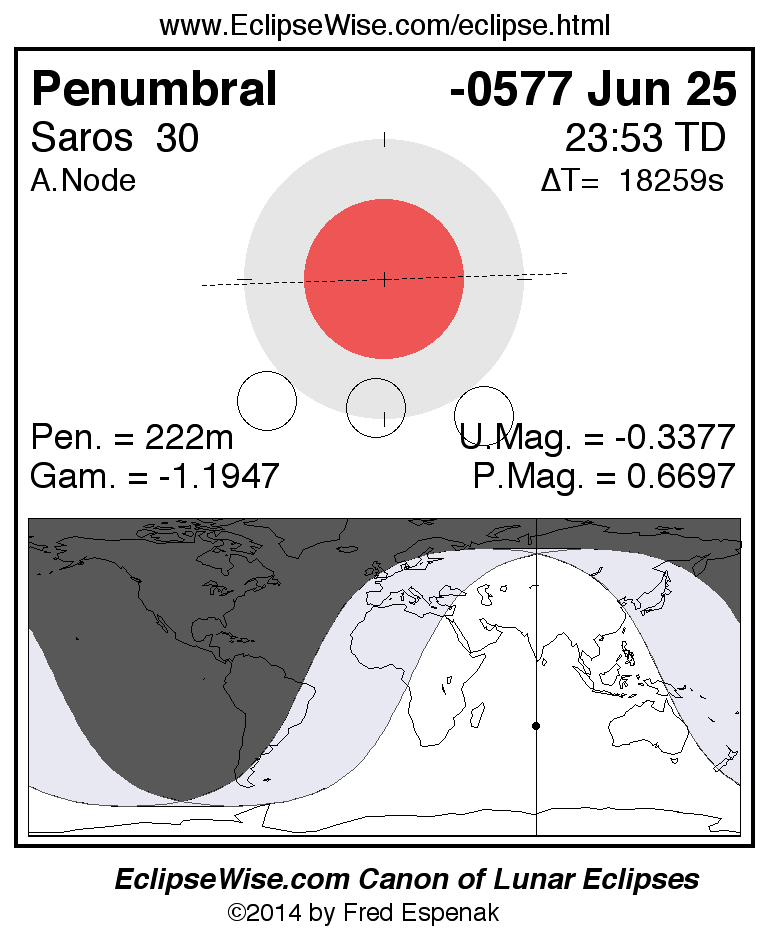 The instant of greatest eclipse takes place on -0577 Jun 25 at 23:53:14 TD (18:48:57 UT1).