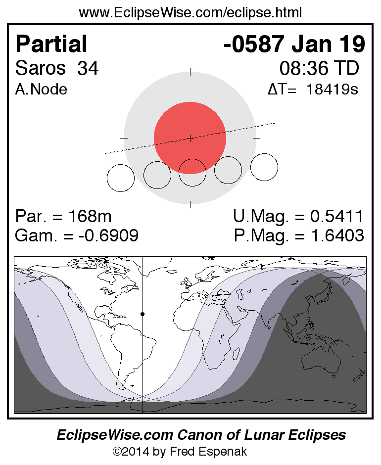 The instant of greatest eclipse takes place on -0587 Jan 19 at 08:35:49 TD (03:28:53 UT1).