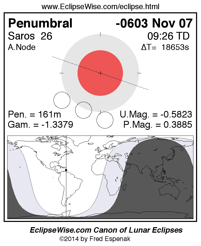The instant of greatest eclipse takes place on -0603 Nov 07 at 09:26:17 TD (04:15:27 UT1).