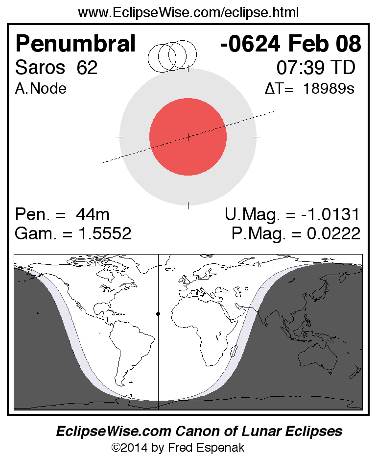 Another lunar eclipse occurs one synodic month before the -0624 Feb 08 eclipse. It is the penumbral lunar eclipse of -0624 Jan 09.