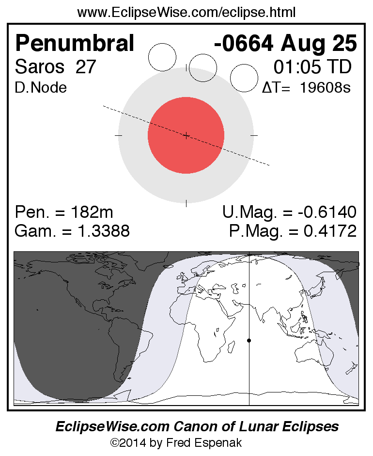 Penumbral Lunar Eclipse of -0664 Aug 25 (0665 Aug 25 BCE)
