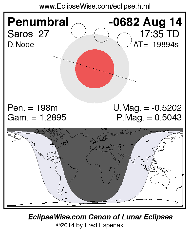 The instant of greatest eclipse takes place on -0682 Aug 14 at 17:34:33 TD (12:03:01 UT1).