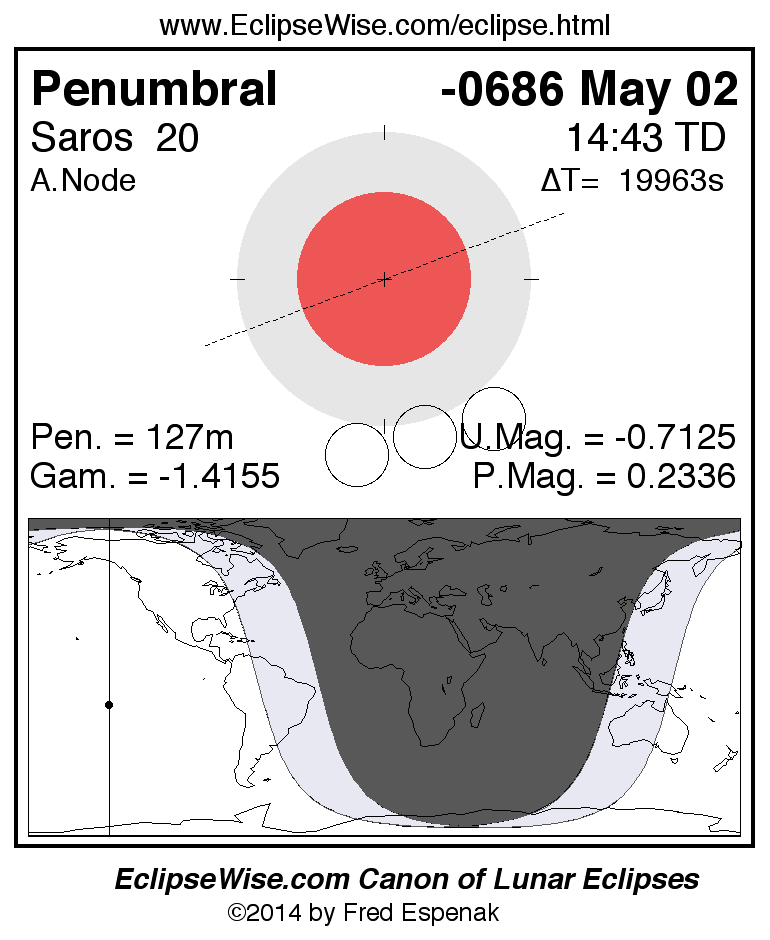The instant of greatest eclipse takes place on -0686 May 02 at 14:42:50 TD (09:10:10 UT1).