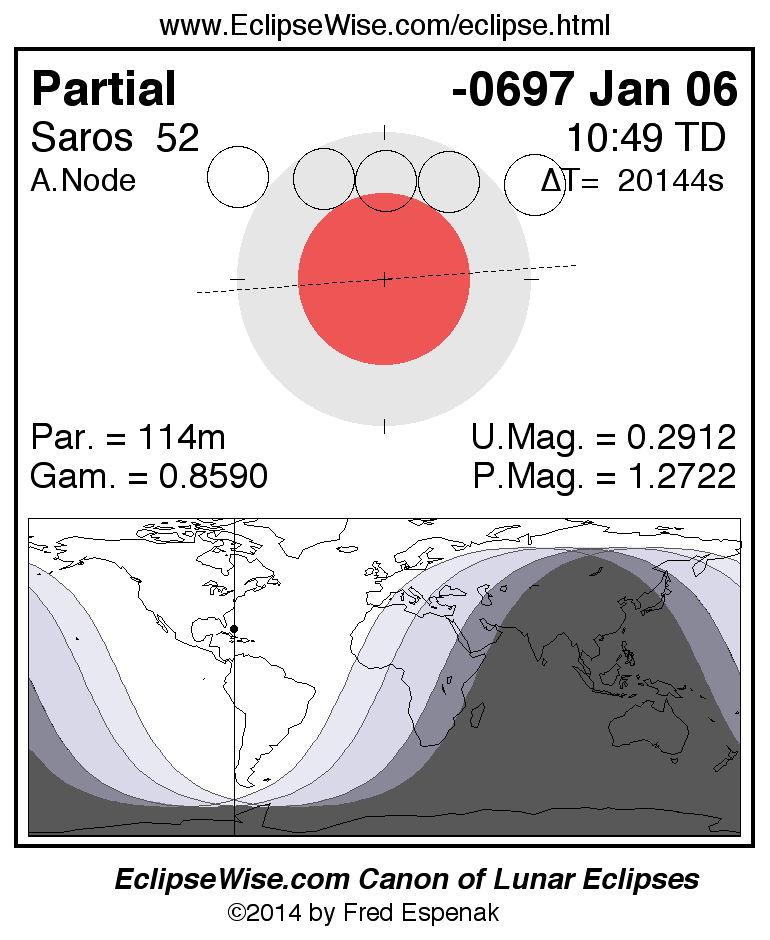 The instant of greatest eclipse takes place on -0697 Jan 06 at 10:49:16 TD (05:13:34 UT1).