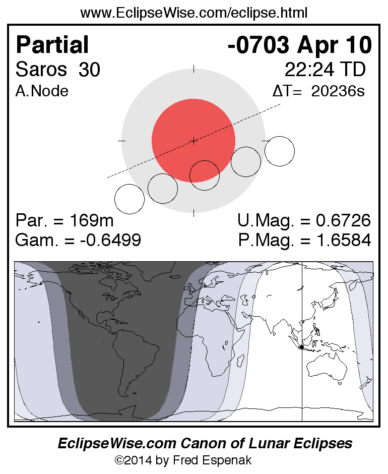 The instant of greatest eclipse takes place on -0703 Apr 10 at 22:23:38 TD (16:46:25 UT1).
