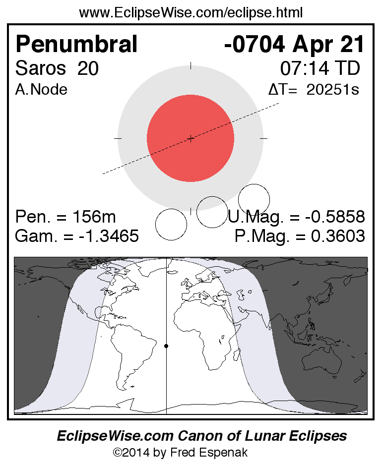Penumbral Lunar Eclipse of -0704 Apr 21 (0705 Apr 21 BCE)