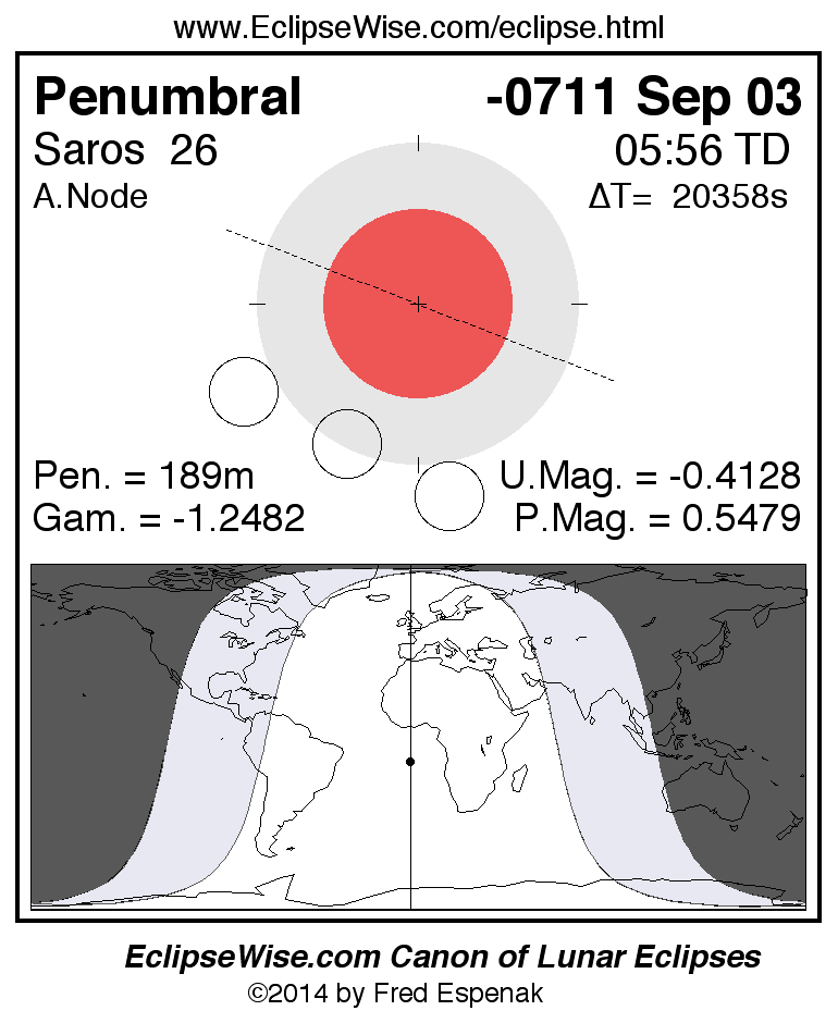 The instant of greatest eclipse takes place on -0711 Sep 03 at 05:56:12 TD (00:16:56 UT1).