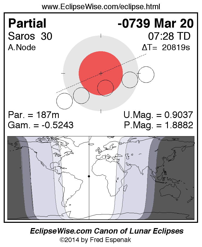 The instant of greatest eclipse takes place on -0739 Mar 20 at 07:28:09 TD (01:41:12 UT1).