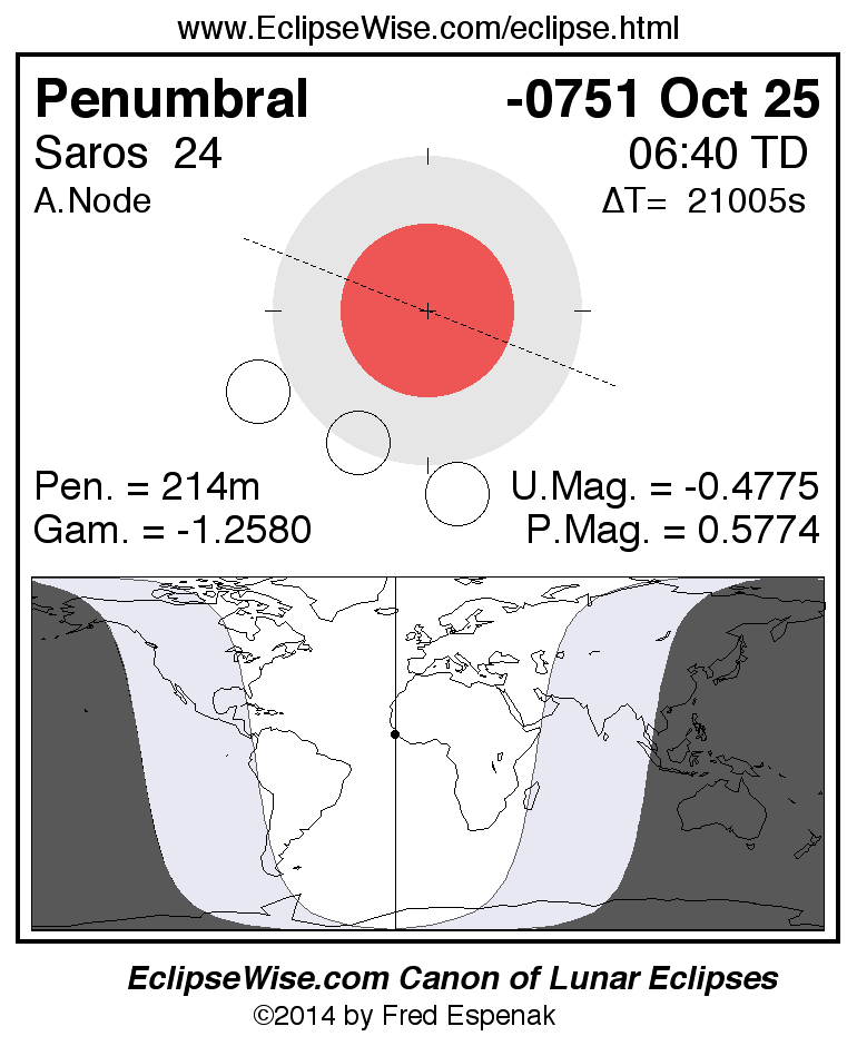 The instant of greatest eclipse takes place on -0751 Oct 25 at 06:40:19 TD (00:50:16 UT1).