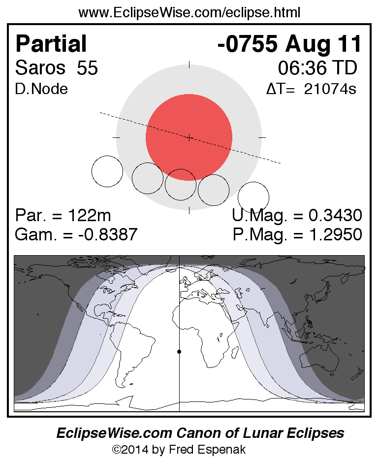 The instant of greatest eclipse takes place on -0755 Aug 11 at 06:36:09 TD (00:44:58 UT1).