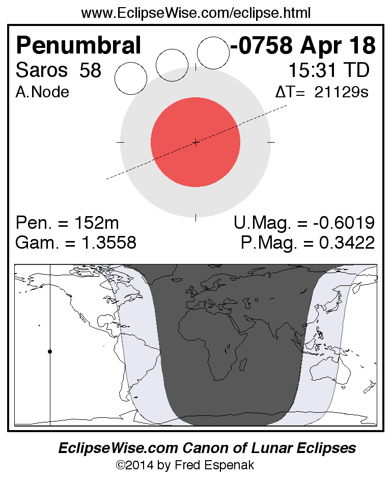 Another lunar eclipse occurs one synodic month before the -0758 Apr 18 eclipse. It is the penumbral lunar eclipse of -0758 Mar 20.