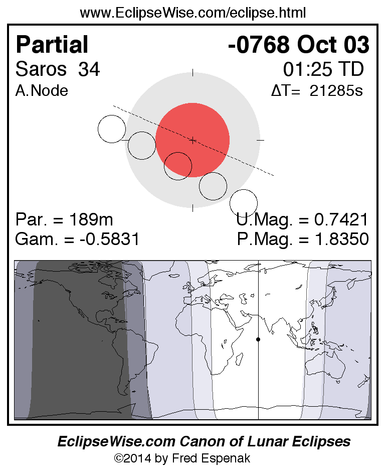 The instant of greatest eclipse takes place on -0768 Oct 03 at 01:24:44 TD (19:30:01 UT1).