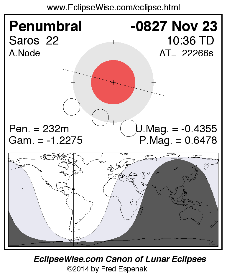 Penumbral Lunar Eclipse of -0827 Nov 23 (0828 Nov 23 BCE)