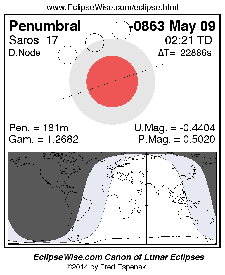 Another lunar eclipse occurs one synodic month after the -0863 May 09 eclipse. It is the penumbral lunar eclipse of -0863 Jun 07.