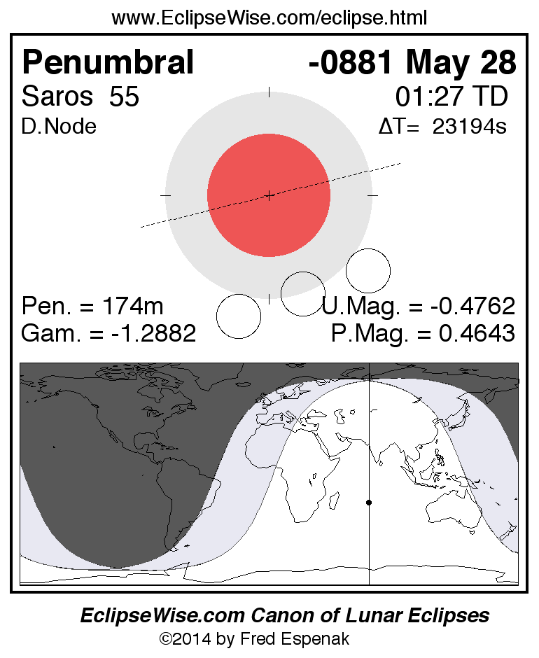 Another lunar eclipse occurs one synodic month before the -0881 May 28 eclipse. It is the penumbral lunar eclipse of -0881 Apr 28.